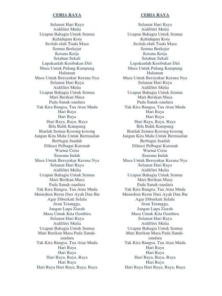 Hari Raya Hari Raya Hari Raya Raya Raya. Semoga bermanfaat untuk anda. Sebulan sudah berlalu Hari ceria menjelma tiba Cantik berseri berbaju baru Duit raya penuh di saku.